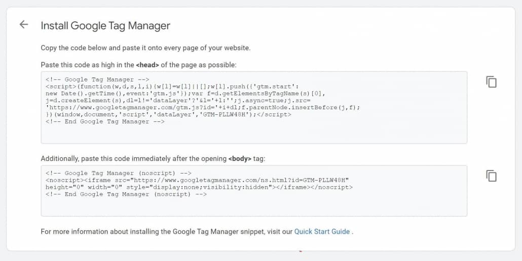 After this step, you’ll set up your GA account as explained above up to the point of getting your tracking ID. Shopify users should follow these instructions to set up GA and GTM for their website.